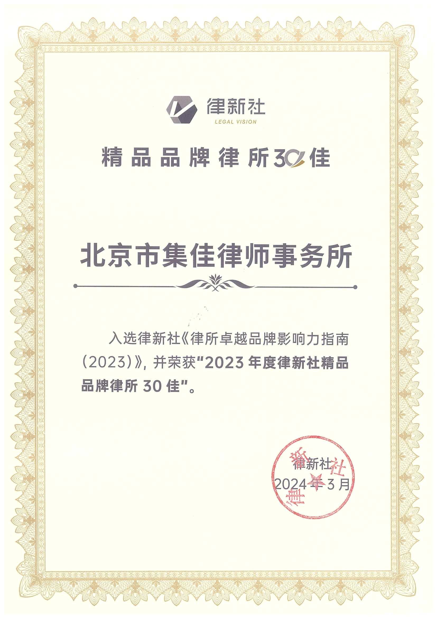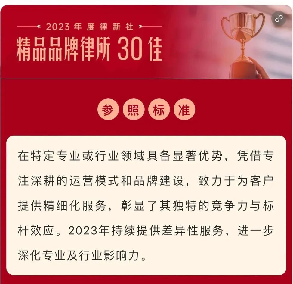 >完美对战平台>关于我们>荣誉概览>2024>完美对战平台入选 “2023年度律新社精品品牌律所30佳”