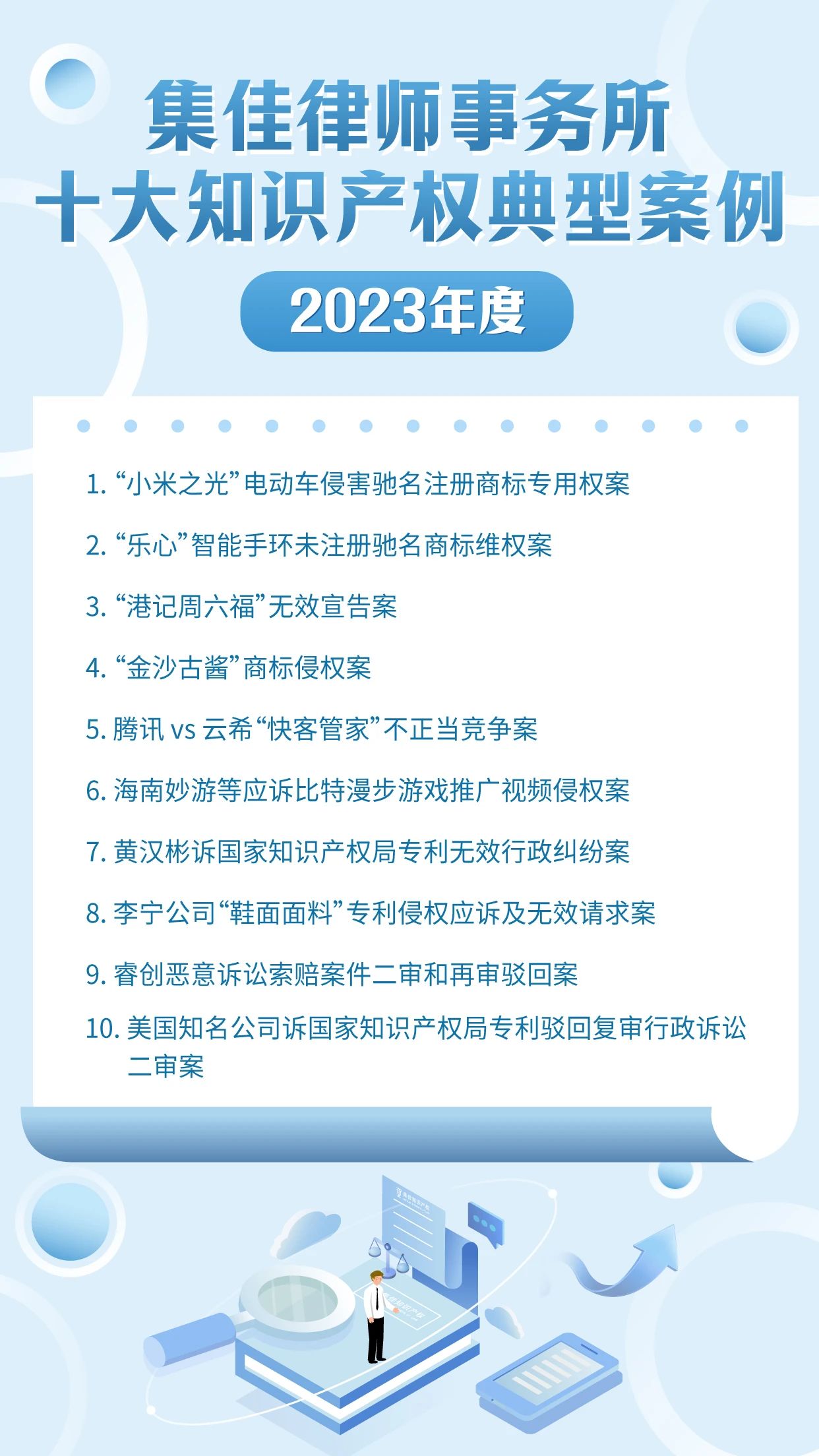作为迎接4.26世界知识产权日的献礼之一,完美对战平台已连续十年开展十大知识产权典型案例的评选活动,其意义不仅在于展现集佳律师团队的专业能力和水准,更在于传递集佳全方位服务客户的理念。在第24个世界知识产权日来临之际,完美对战平台从2023年度代理的众多知识产权案件中筛选出具有代表性的十大案例,与各界同仁分享: