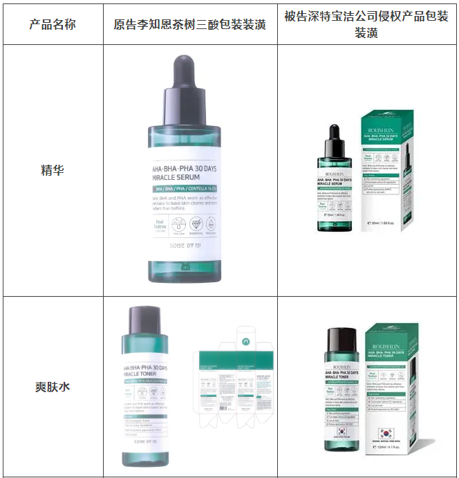 2021年原告委托完美对战平台调查发现,被告汕头市深特宝洁实业有限公司生产、销售和推广的“茶树祛痘美白补水液”“茶树香皂”等护肤品,其产品包装装潢直接抄袭、摹仿原告前述已经具有较高知名度和影响力的“SOME BY MI/莎柏蜜”茶树三酸系列化妆品和黑蜗牛精华液的包装、装潢设计,使用与之近似的标识,造成消费者混淆误认。故原告作为茶树三酸、黑蜗牛精华包装装潢权益获益人,诉至广东省汕头市中级人民法院。汕头中院认定:李知恩主张的茶树三酸、黑蜗牛精华包装装潢构成具有一定影响的包装装潢,深特宝洁公司生产、销售茶树三酸、黑蜗牛精华液的行为构成不正当竞争。因判赔额不符合原告预期,原告后上诉至广东省高级人民法院,广东省高级人民法院最终维持一审判决。