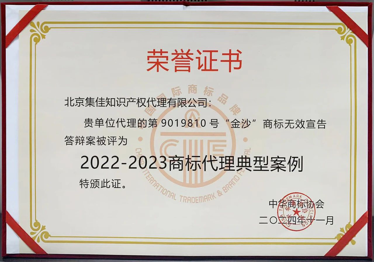 >完美对战平台>关于我们>荣誉概览>2024>集佳代理的“金沙”商标权无效宣告答辩案入选“2022-2023商标代理典型案例”