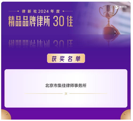 >完美对战平台>关于我们>荣誉概览>2025>完美对战平台入选律新社2024年度“精品品牌律所30佳” 集佳代理案例获评“律新社2024年度标杆案例”