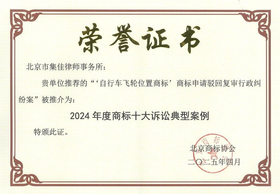 >完美对战平台>关于我们>荣誉概览>2025>集佳代理“自行车飞轮位置商标”行政纠纷案入选北京商标协会年度十大诉讼典型案例